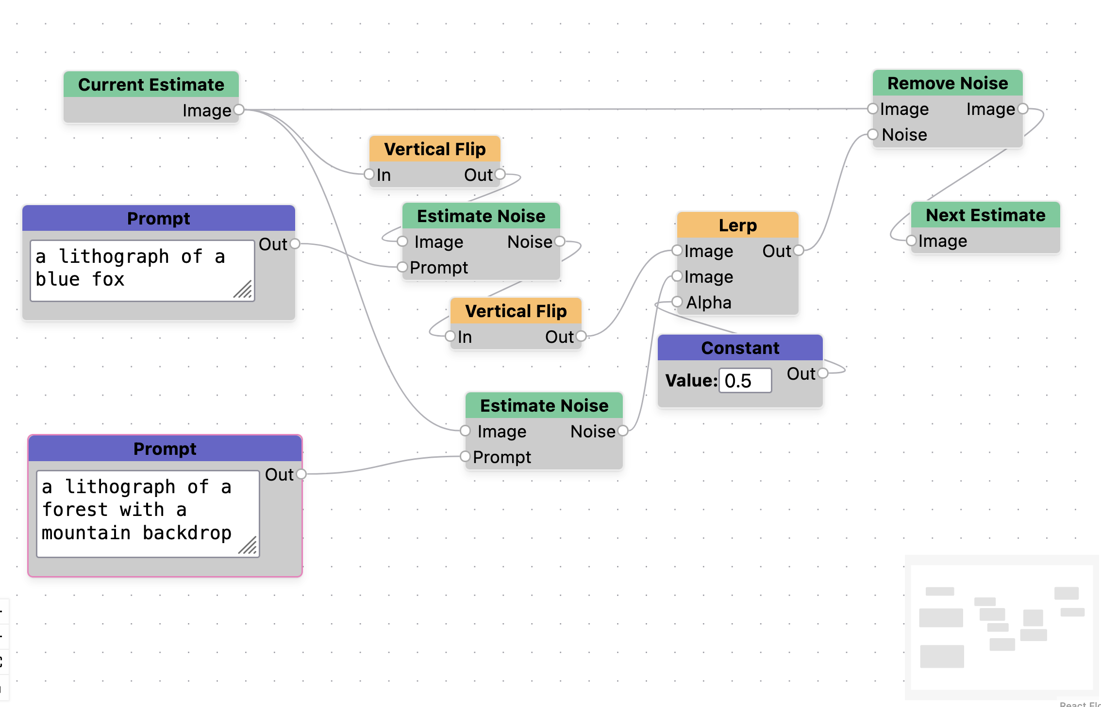 We also produce a test of whether the iteration part of the tool can produce novel images. In this case we produce a visual anagram like from Geng et al. [7]. We accomplish this by flipping the image before denoising, denoising with a different prompt, then flipping the noise estimate. For the example in Figure 7, we use the prompts a lithograph of a forest with a mountain backdrop and a lithograph of a blue fox. We can see that the foxes legs are reinterpreted to form the shape of the mountain. A screenshot of the graph used to generate this can be found in the Appendix, Figure 12.