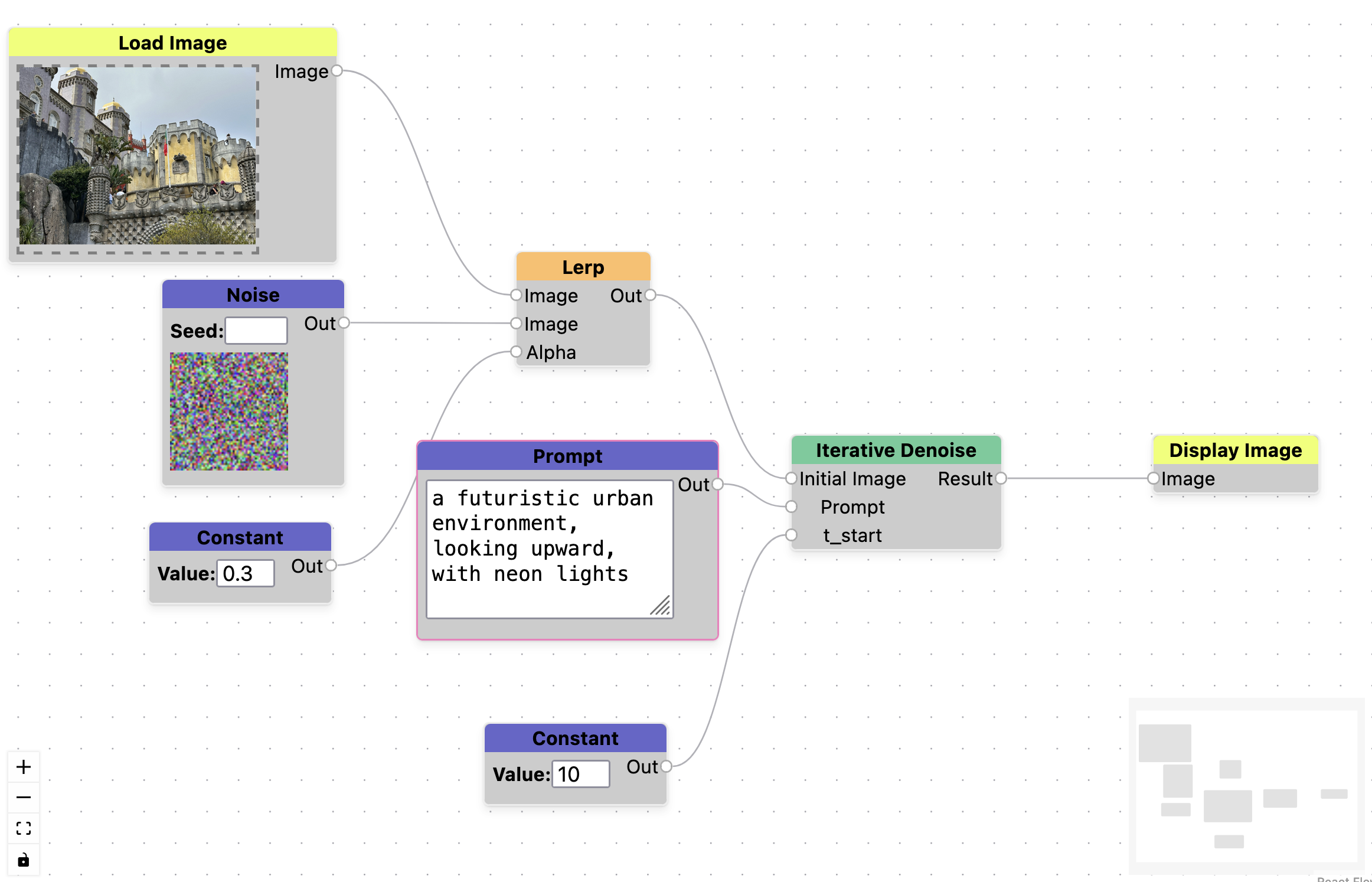 First we test the ability of the tool to support inpainting. We accomplish this by creating a program that adds partial noise to an existing image (α=0.5), and then begins the diffusion process part way through (t_start=14). We test this on an image of Pena Castle taken in Portugal, and provide the prompt a futuristic urban environment, looking upward, with neon lights. The results can be found in 3. A screenshot of the graph used to generate these images is in the Appendix, Figure 9.