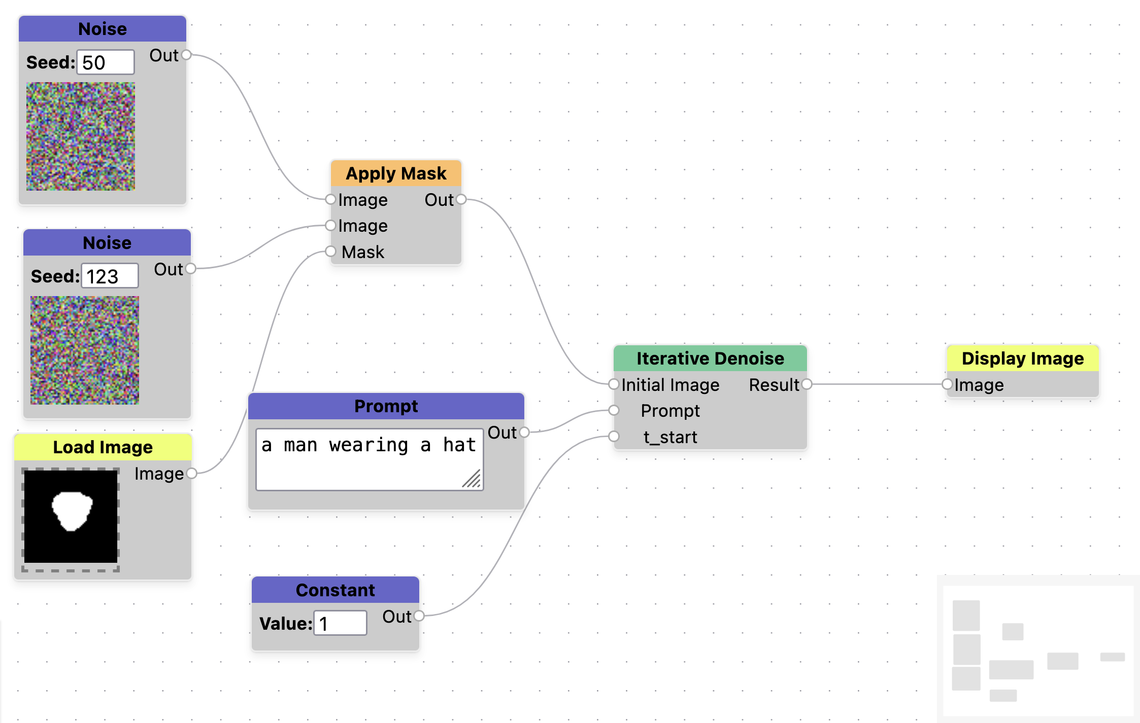 We also test the ability to manipulate noise in the initial conditions stage. On first instinct, if we generate an image from some noise with the prompt a man wearing a hat, and want to keep parts of that image, it should be possible to mask out that noise and fill in the rest with noise from a different image. We do this by taking noise images generated with seed=123, 50 and merge them using a mask. Where the mask pixels are white, we take pixels from seed=123, and where they are black we take pixels from seed=50. Figure 4 shows the results of this process, which are unsuccessful. What this implies is that the final image that gets produced is not based on each individual pixel value, but is based on some total influence of all of the noise in the image. See Appendix, Figure 10 for the graph used to generate this experiment.
