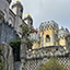 Figure 3. Inpainting example. Image (a) is a photograph taken of Pena Castle in Portugal. Image (b) is an image generated with the prompt a futuristic urban environment, looking upward, with neon lights, blended with 50% noise.