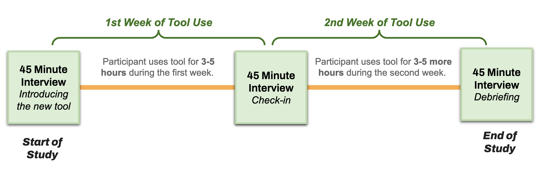 During recruitment we will select for artists that have some amount of technical skills. These might be shader artists, procedural artists, or artists that have some experience using existing diffusion based tools. The study will consist of a two week deployment (See Figure 8), where participants will be asked to use the tool for 3-5 hours per week. After the first week, we will conduct a check-in interview to solicit feedback about the tool and collect information on how they are progressing in learning how to use it. They will then spend another week using the tool, which will be followed up by another check in. We will also measure the ability for our tool to support creative work through survey instruments such as the Creativity Support Index [5].